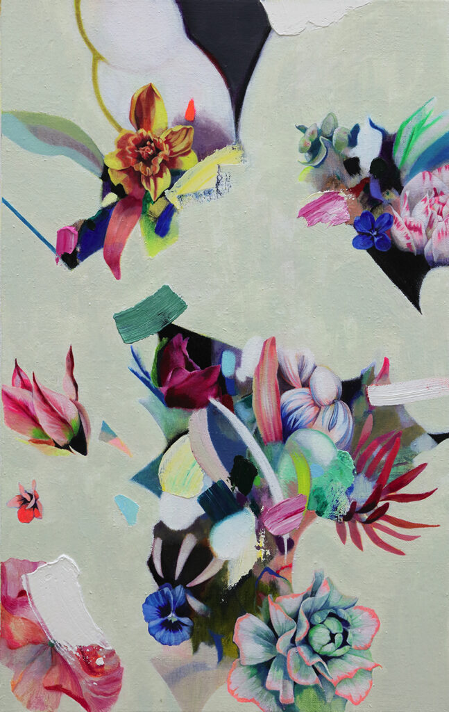 自己、女性性、生命、関係、愛などをテーマに、花や身体をモチーフに半抽象画を描く。筆を重ねるうちに、花や身体の像は揺らぎ、ほどけはじめ、鮮やかな色や厚く塗られた画面へと変容する。油絵の具を重ね、削り、拭き取り、また描く―その反復は、表象と非表象、存在と不在の間を往還する作業であり、そこに立ち現れるものは、身体のジェンダー的規定や花の象徴性を超えた「存在そのものを探る」試みでもある。その画面は画家の心の奥に残る微細な感覚や、過ぎ去った時間の余韻をも抱え込む。