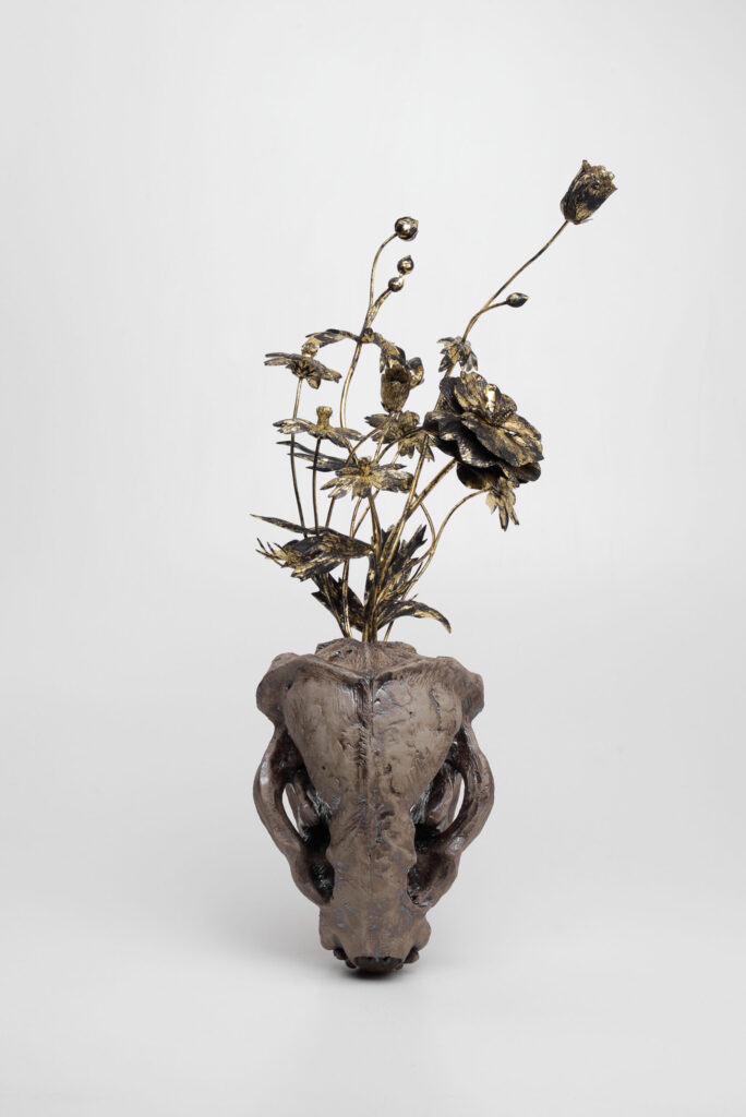 長谷川寛示は、作者である自分と作品との関係性や、「時間」という不確かなものへの関心を軸に彫刻制作を行っている。「剥がれた金箔や、経年変化を伴った彫刻表現は、時間の経過を示すと同時に、枯れゆく花という儚い存在を自分の人生を超えて残るものへと変容させる。それは、花を見ている自分自身こそが儚いものであるという視座の変容をもたらす、時間的な跳躍でもある」と長谷川は語る。