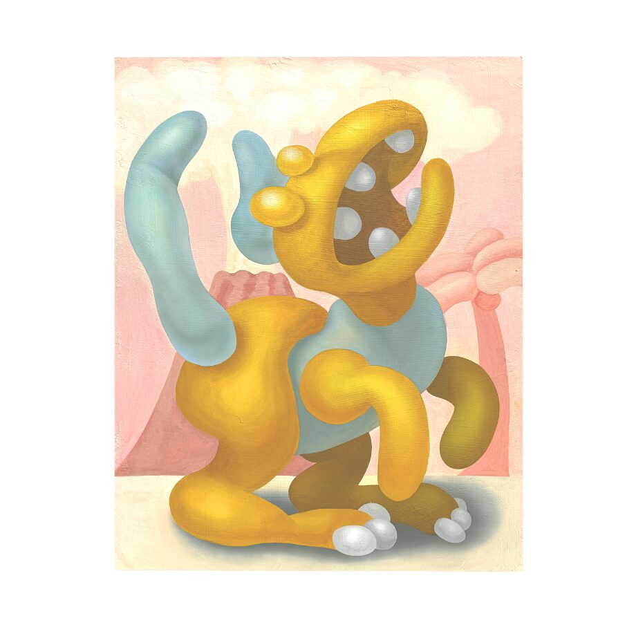 1980年代のポップアートやポストモダニズム、特にジェフ・クーンズの作品に影響を受けた「Fragile creatures」シリーズで描くのは、バルーンのような薄い皮膜のボディしか持たず、危ういバランスの中で生きている、あるいはかつて生きていた存在。キャンバス上に描かれた彼らと、人間が避けがたく加担してしまう大量生産・大量消費が生む「いのちの消費」という彼らの背後に存在する現実を重ね合わせて提示している。