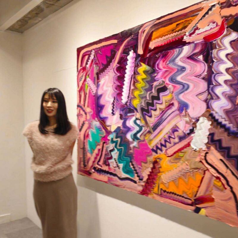 2021年アメリカに渡りベビーシッターとして働きながら、資本主義や啓蒙主義、差別を体感、思いを巡らせ、2023年にアーティスト活動を開始しました。渡米前に仏教の思想を学んだことも影響し、世界に対する問題提起の思いを作品に込めるようになりました。ジグザグの筆致は二項対立の矛盾や対立を超えた立場をとる「中道思想」、混色せずに併存するカラフルな色彩は「対話」を意味しています。思想と思想、個人と個人、国と国。何色もの色彩が混ざり切ることなく、ギザギザに共存する作品は、様々な問題を抱えながらも、個々が自立し、リスペクトしあいながら対話をしていく、バランスをとることで共存している、社会を表しています。